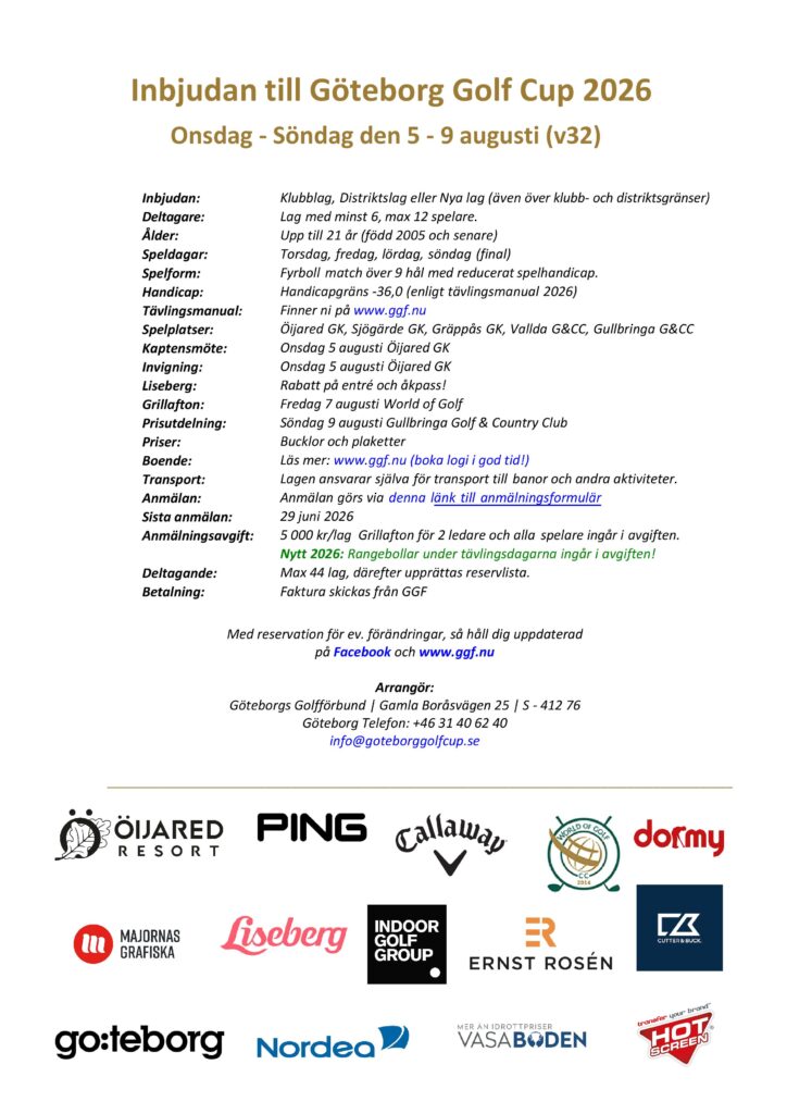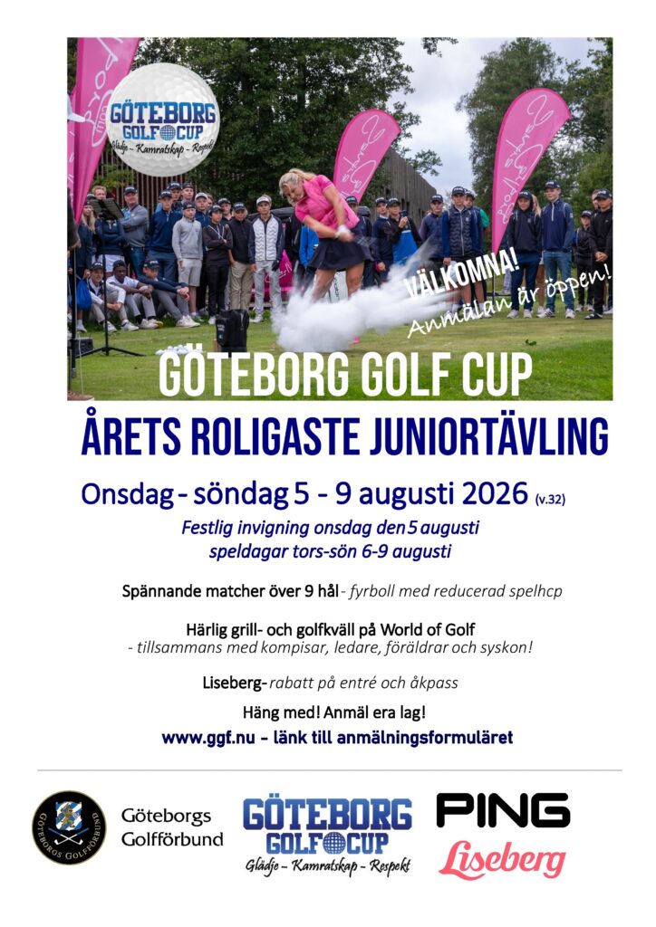 Kongsberg Golf er meldt på Göteborg Golf Cup som spilles 5.-9. august 2026 • Det ser ut til at vi kanskje kan delta med to lag i år – Vi ønsker at dere som vet at dere skal være med om å melde seg så fort som mulig • Alle må bekrefte sin deltakelse i Spond – følg med på Kongsberg GK Junior (MHOXD) – påmelding åpner snart!