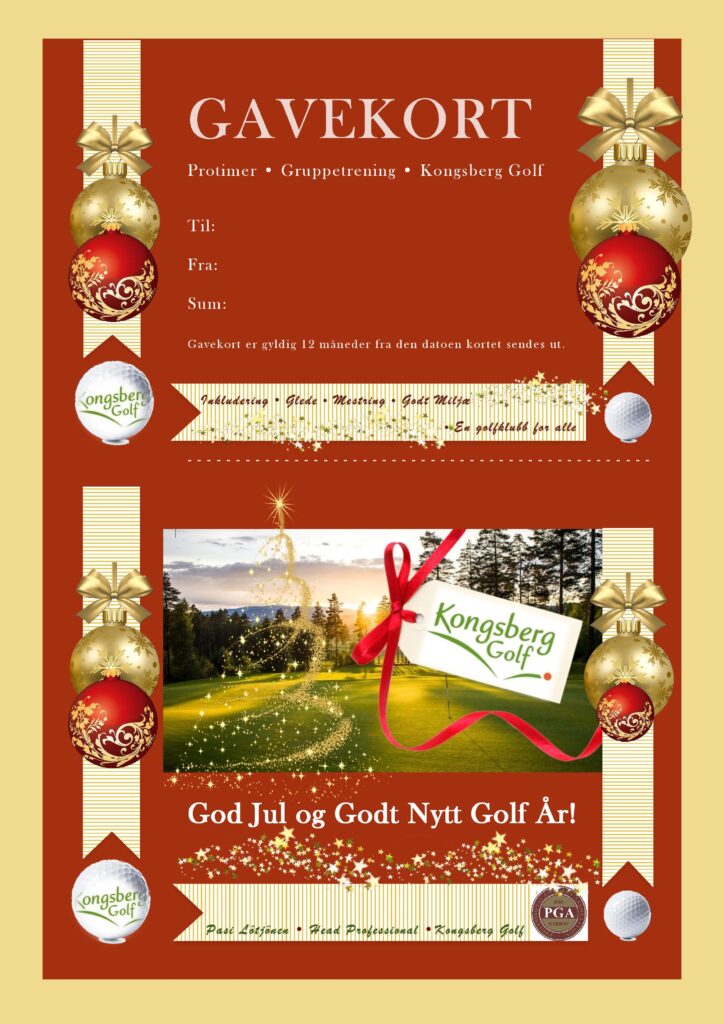 Bestilling av gavekort: Gavekortet bestilles ved å sende en e-post til: pro@kongsberggolf.no og kan betales enkelt med Vipps • Gavekortet som julegave må bestilles innen 18. desember 2025.